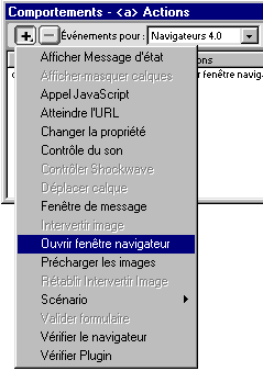 Dans la barre d'outil de la fenêtre "Comportements" choisissez les types de navigateurs pour lesquels vous travaillez. Dans l'état actuel des choses, préférez les navigateurs 4 aux versions ultérieures qui ne sont pas compatibles entre elles. Cliquez ensuite sur le signe + de la fenêtre "Comportements" et choisissez "Ouvrir fenêtre navigateur" |