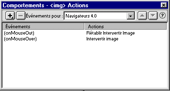 Désormais les deux comportements sont affichés lorsque l'image est sélectionnée. Il est possible de modifier les évènements à son goût en mettant l'évènement en surbrillance et en activant le menu déroulant. Pour tester le javascript, enregistrez votre fichier et vérifiez dans le navigateur de votre choix. |