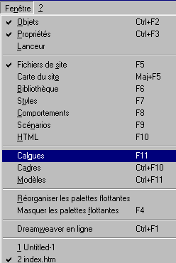 Les calques sont pris en charge à partir des versions 4 des navigateurs. Pour montrer des images ou des textes de façon permanente, ils sont superflus et posent des problèmes de recouvrement des textes et tableaux préexistants car l'auteur ne maîtrise pas le paramétrage du navigateur par l'utilisateur. Les calques cachés ne présentent pas cet inconvénient si l'on prend la précaution de bien les positionner et de les faire disparaître lors de l'événement suivant. On peut ainsi faire apparaître une image ou une légende de façon contextuelle par un simple survol du lien. Dans la version 2 de Dreamweaver il n'est pas possible d'associer un comportement à une zone de lien dans une image (image map). La version 4 le permet | |